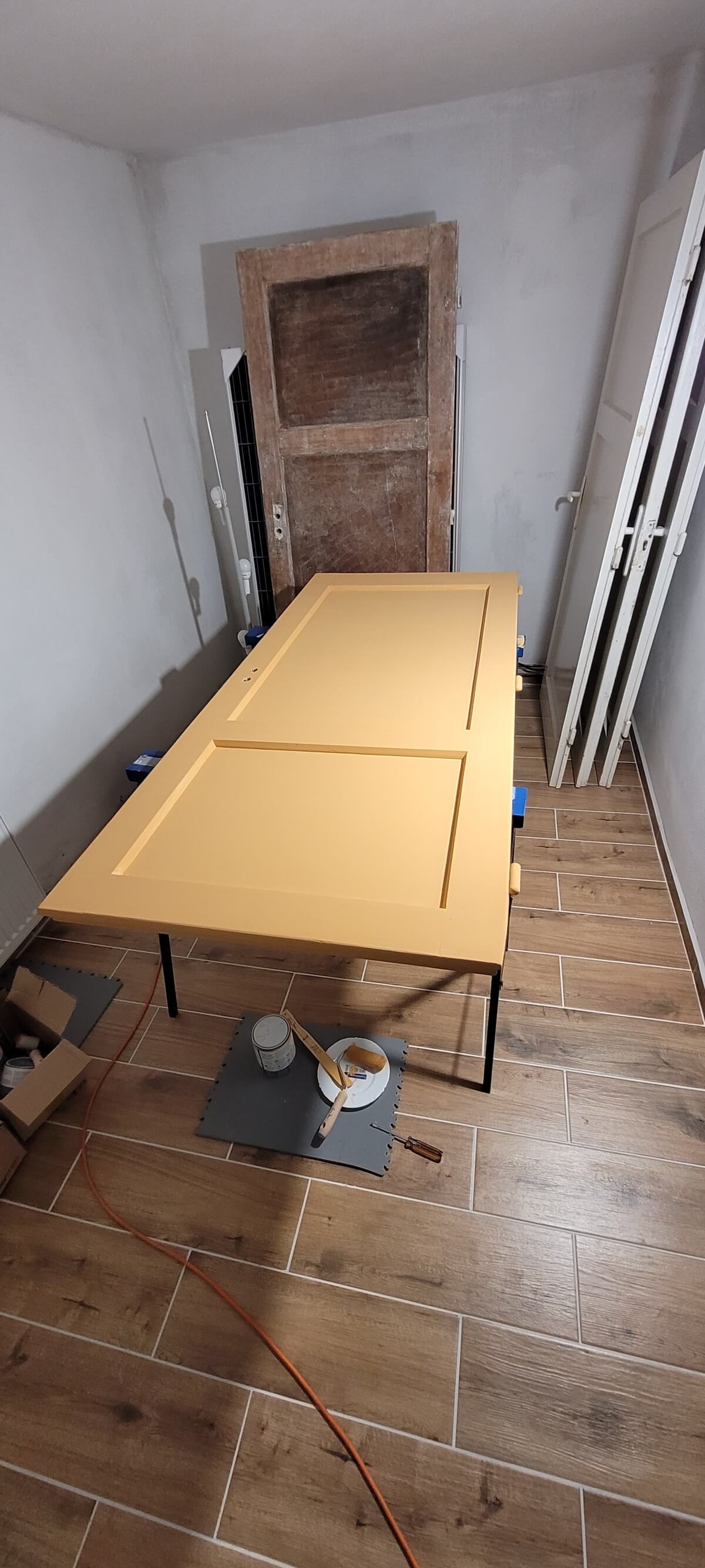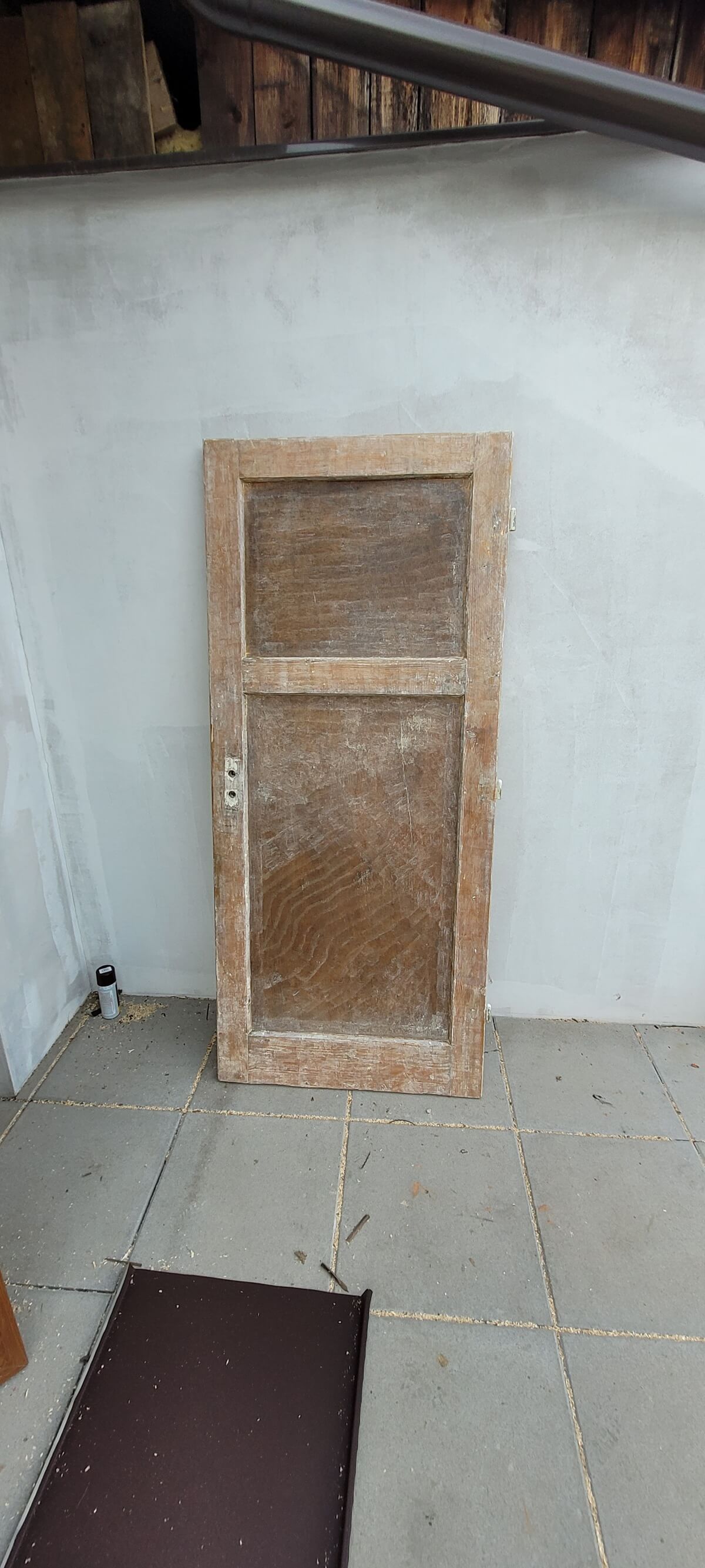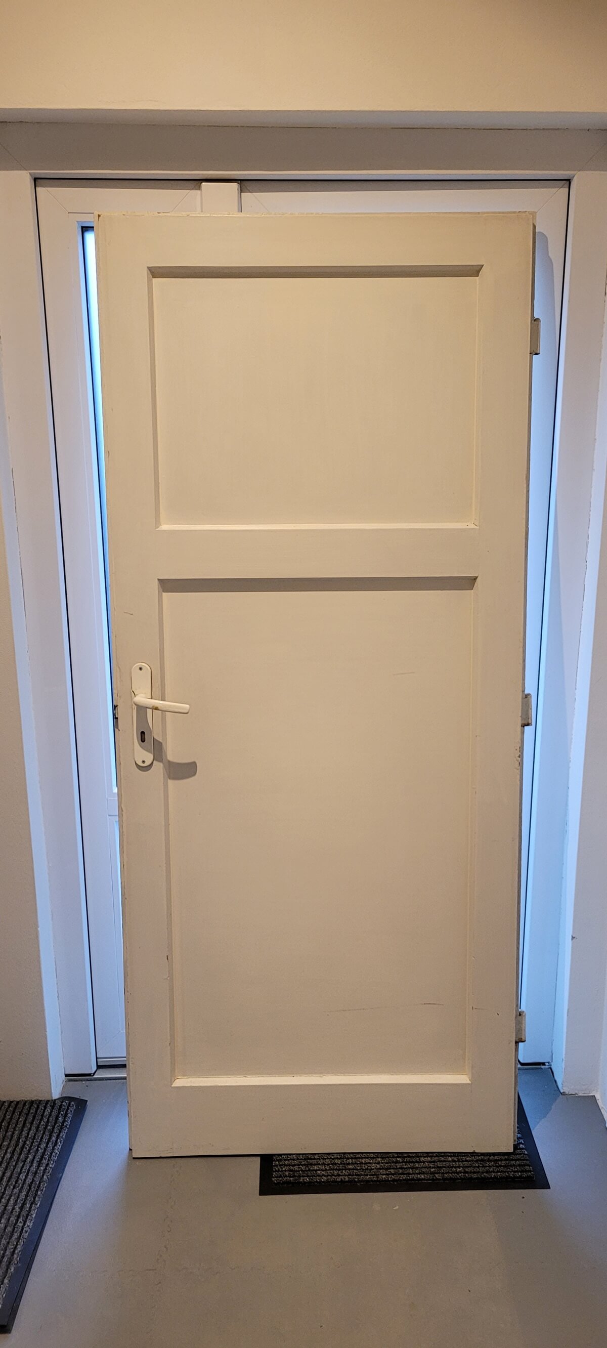 Dvere a zárubne sú masívne a majú viac ako 60 rokov. Mali na sebe 3 staré lúpajúce nátery. Starú farbu som najskôr opálil, potom dvere aj zárubne vybrúsil nahrubo a potom nahladko. Potrebné veľké poškodenia som vytmelil a opäť prebrúsil.