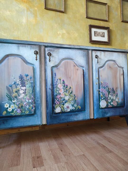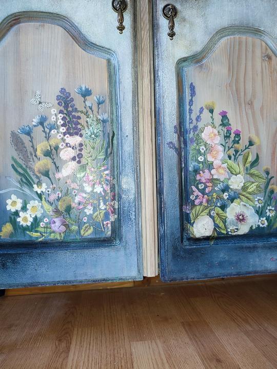 Komodu, ktorá bola riadne opotrebovaná, som takto pozmenila. Drevo bolo veľmi zničené, s hlbokými škrabancami a rôznymi nerovnosťami. Brúsenie väčšine častí nepomohlo a čo sa dalo, som sa snažila zachovať, ale neostalo toho veľa. Kriedovými farbami som vytvárala štruktúry, aby som to celé trochu zjednotila a "urovnala". Predné dvierka zdobí moja maľba lúčnych kvetov, sem tam doplnená transferom.