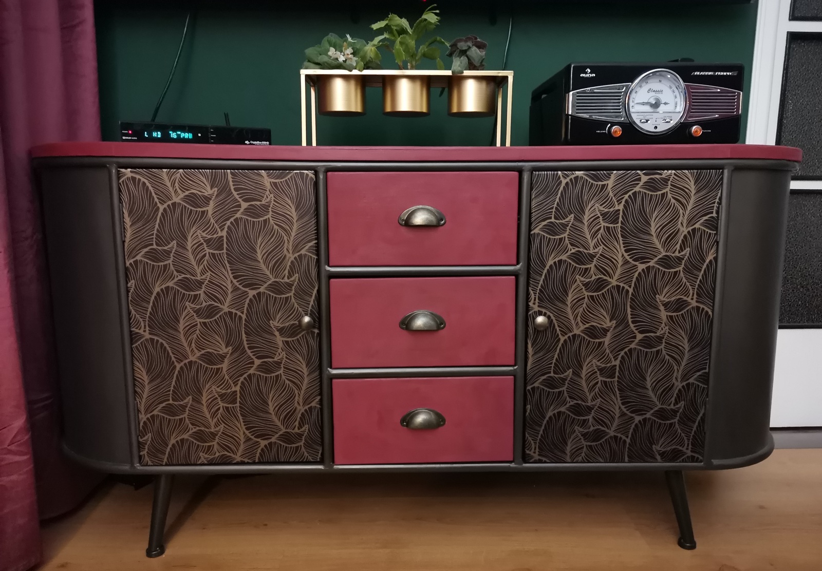 Drevené časti ( vrchná doska a predné časti šuflíkov ) boli natreté kriedovou farbou Annie Sloan, odtieň Burgundy a zalakované Annie Sloan matným lakom. Následne na kovové dvierka som nalepila tapetu s motívom listov a kovové úchytky som pretrela metalickym voskom Annie Sloan - odtieň jasné zlato. Získali tak podobný odtieň ako listy na tapete.