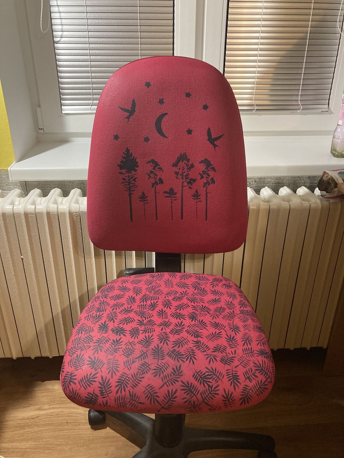 Posielam ešte svoj druhý projekt. Prerobenú kancelársku stoličku kde som použila farby capri pink ako podklad a Oxford Navy na sablonovanie. Zavoskovala som ju priesvitným voskom.