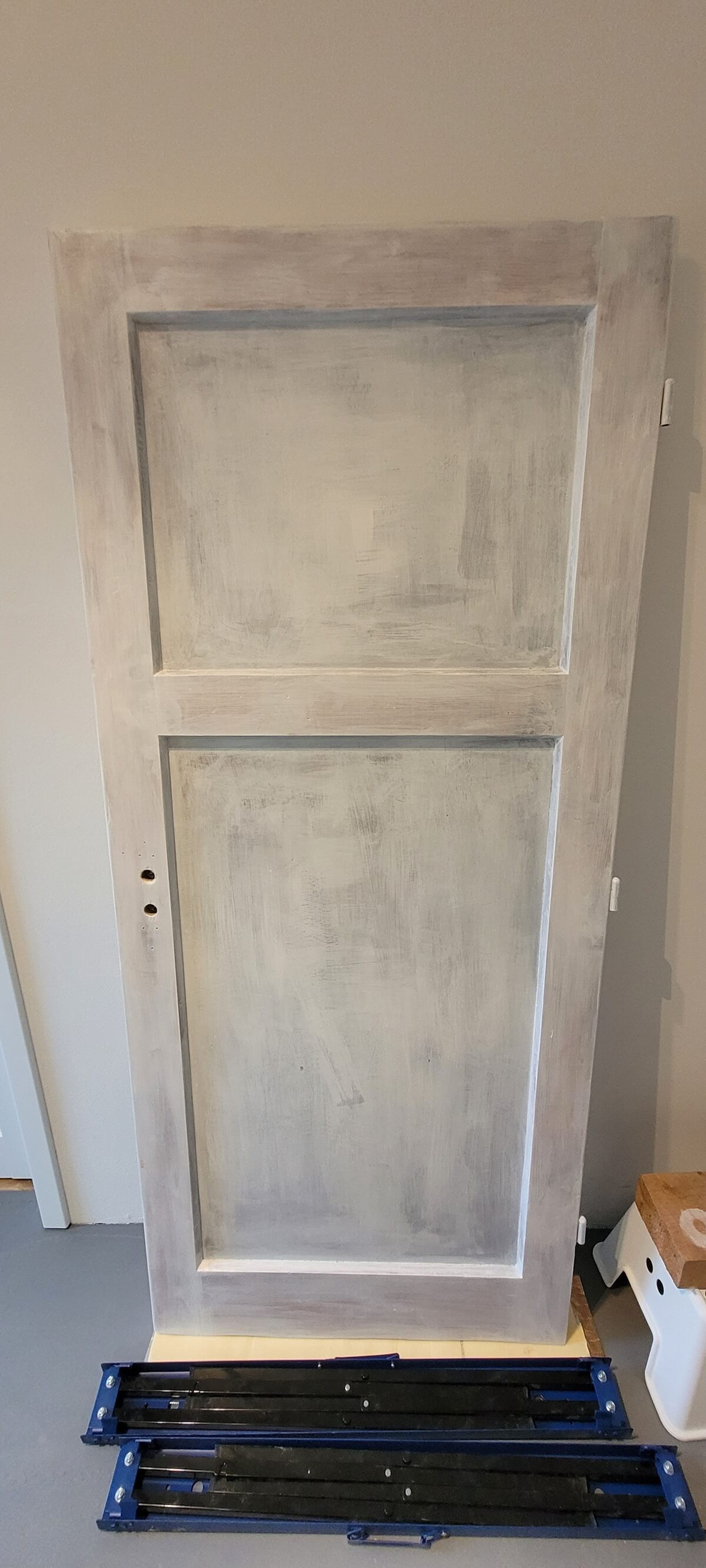 Ako podkladovú vrstvu som použil blokátor škvŕn White Stain Blocker. Na dvere som použil kriedovú farbu Annie Sloan odtieň ARLES a na zárubne odtieň SVENSKA BLUE. Na dvere som na záver namaľoval ornament pomocou šablóny. Použil som odtieň PAPRIKA RED. Všetko som nakoniec zavoskoval CLEAR voskom.