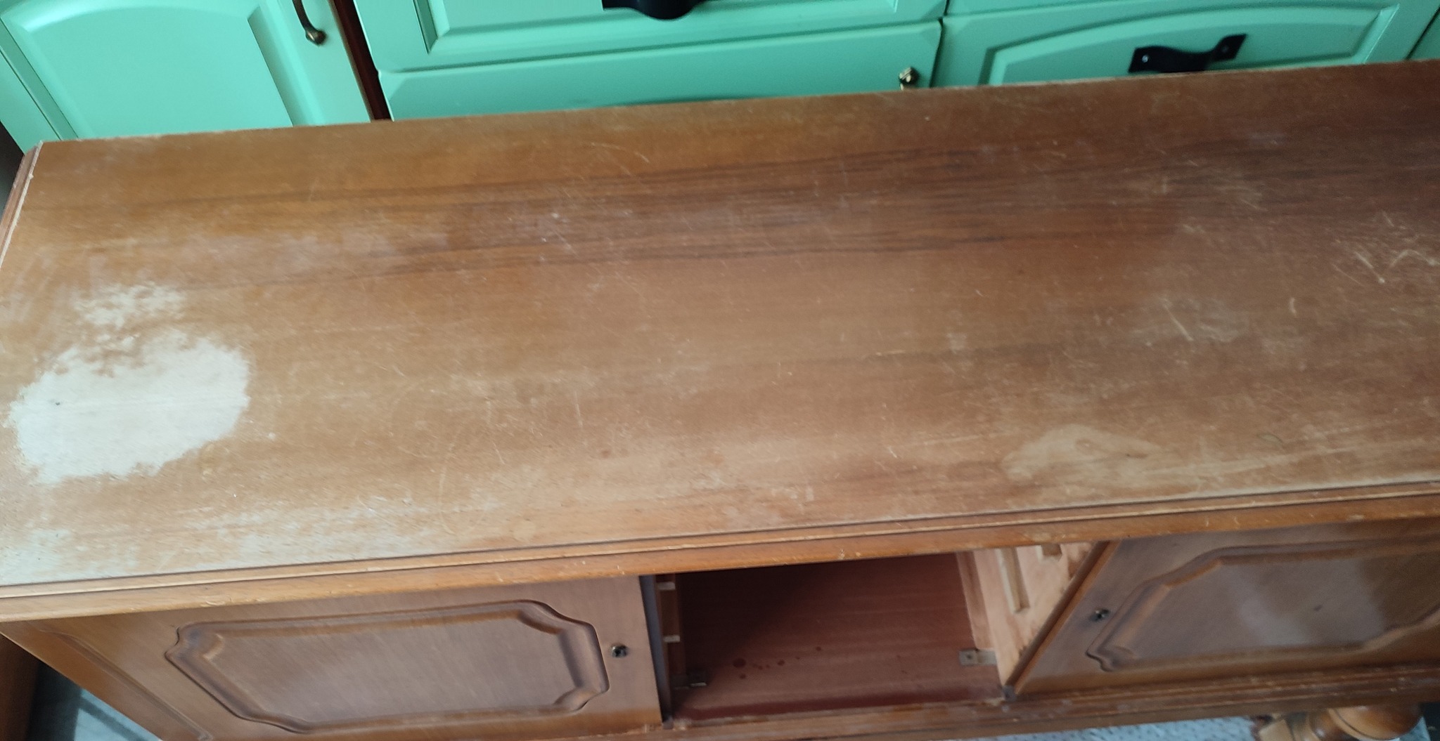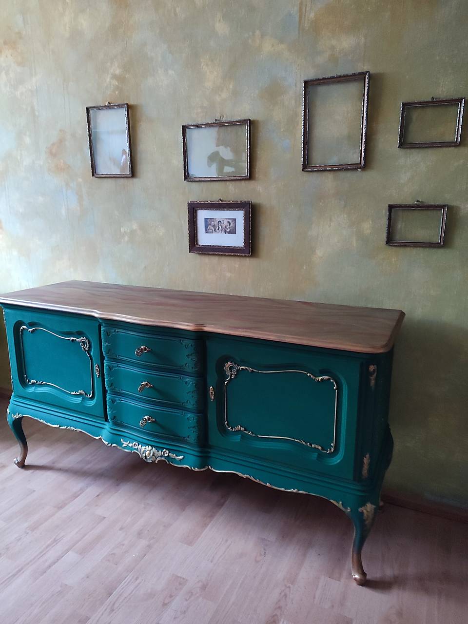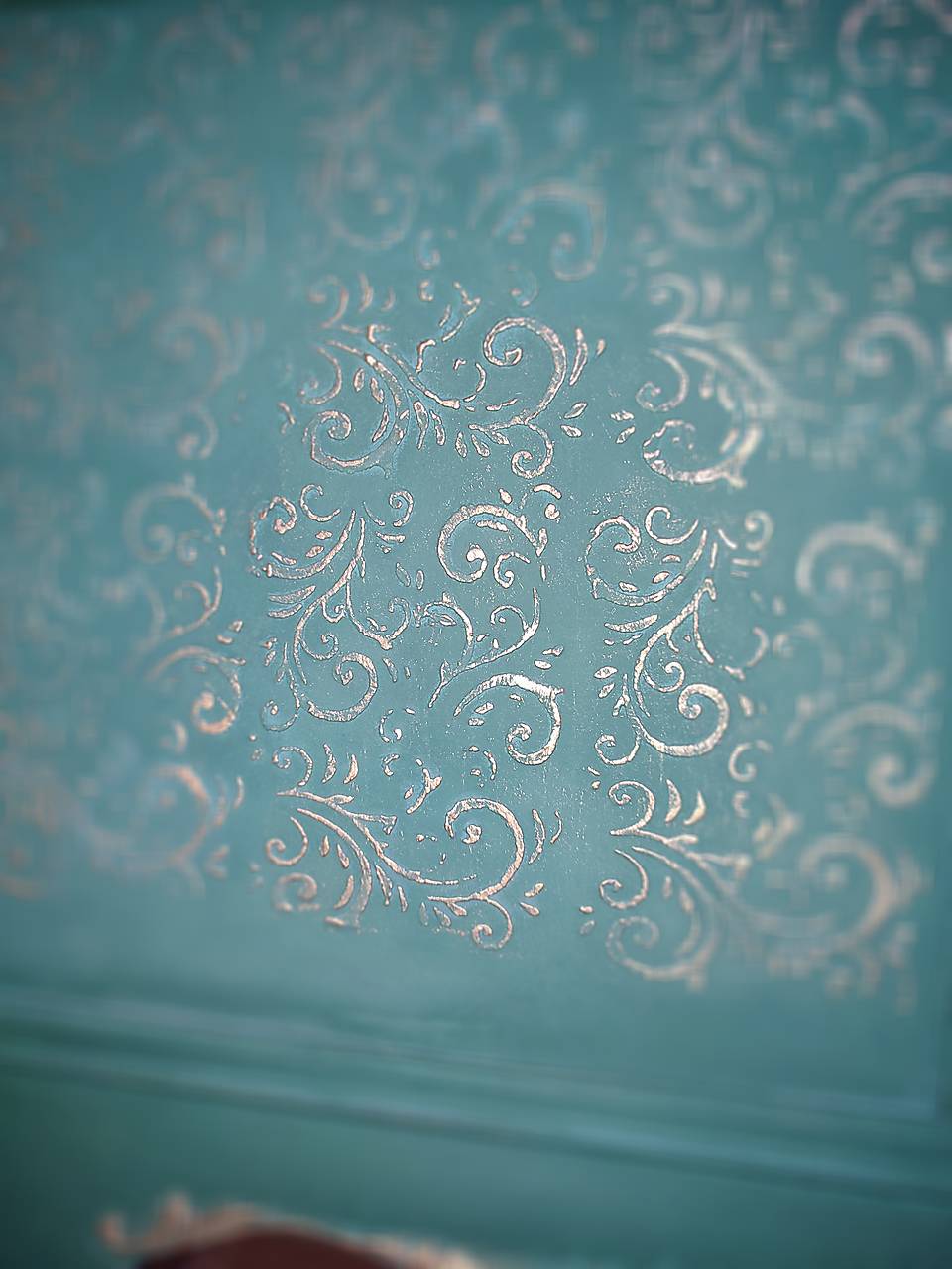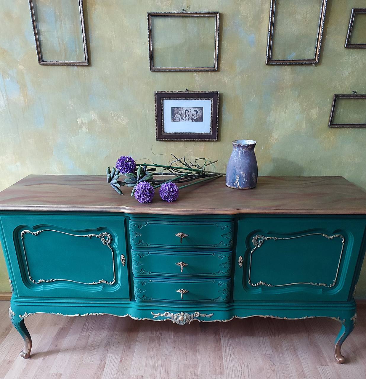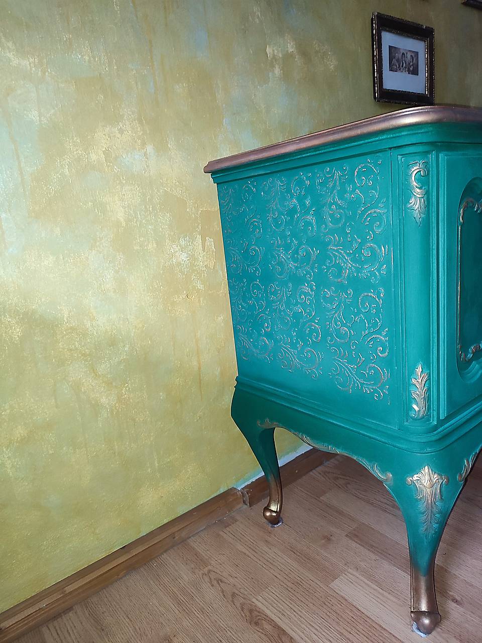 Tento nádherný kus nábytku mal trochu poškrabaný povrch a tak som ho odela do zelenej Amsterdam Green od Annie Sloan a zlatej. Vrchná doska vznikla prelínaním rôznych odtieňov zlatej a medenej farby. Detaily sú taktiež pozlátené farbou a metalickým voskom od Annie Sloan. Bočné strany sú dekorované štruktúrovacou pastou cez šablónu a pohladkané zlatými odtieňmi. Tak isto aj vnútro dvierok je zdobené cez šablónu.