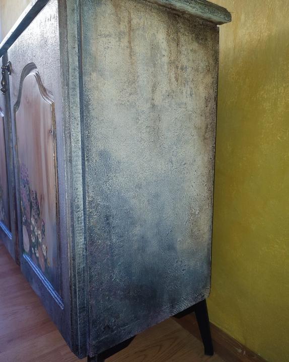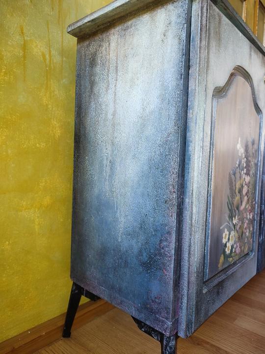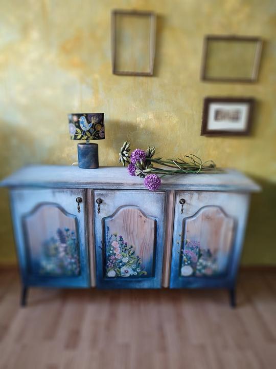 Komodu, ktorá bola riadne opotrebovaná, som takto pozmenila. Drevo bolo veľmi zničené, s hlbokými škrabancami a rôznymi nerovnosťami. Brúsenie väčšine častí nepomohlo a čo sa dalo, som sa snažila zachovať, ale neostalo toho veľa. Kriedovými farbami som vytvárala štruktúry, aby som to celé trochu zjednotila a "urovnala". Predné dvierka zdobí moja maľba lúčnych kvetov, sem tam doplnená transferom.