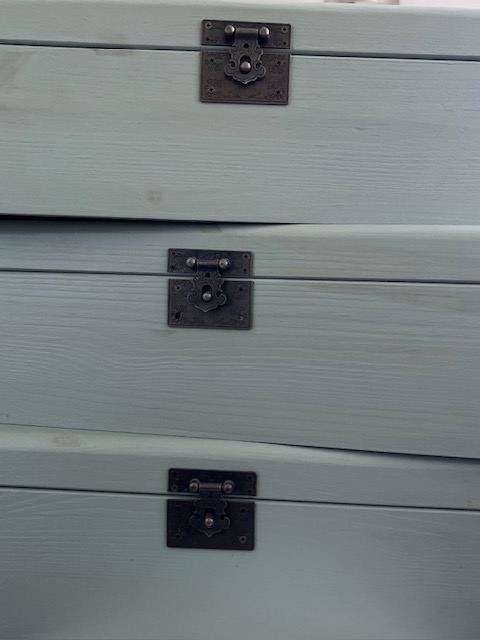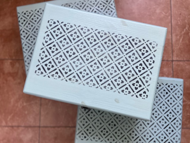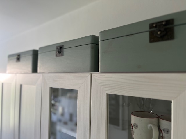 Kúpila som drevené boxy na uskladnenie potravín a zdalo sa mi, že keď ich len prelakujem, bude to trochu nudné. V tom čase som objavila farby Annie Sloan, takže voľba bola jasná. Rozhodla som sa pre jednu vrstvu kriedovej farby Duck Egg Blue, aby presvitala kresba na dreve a na to som použila šalblónu v odtieni Graphite. Celé som to na záver prelakovala.