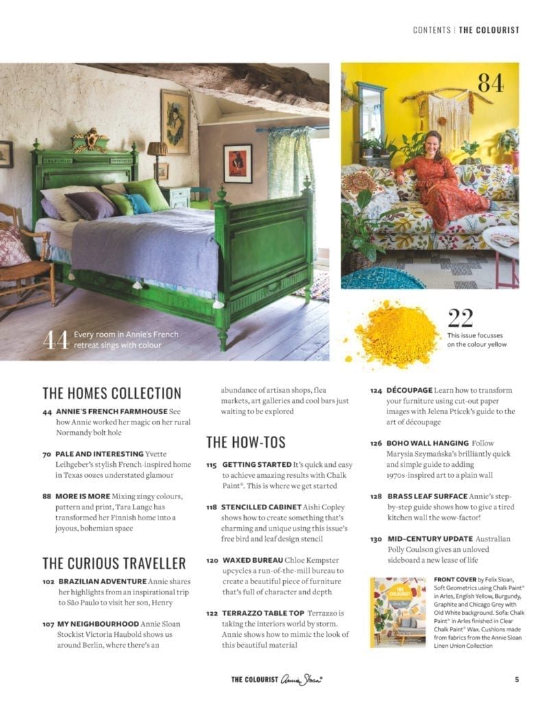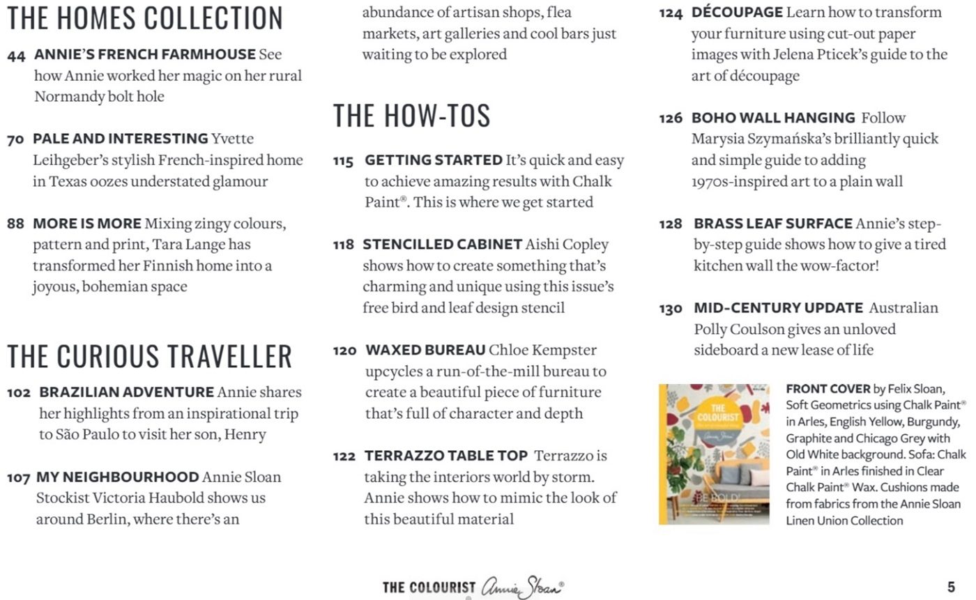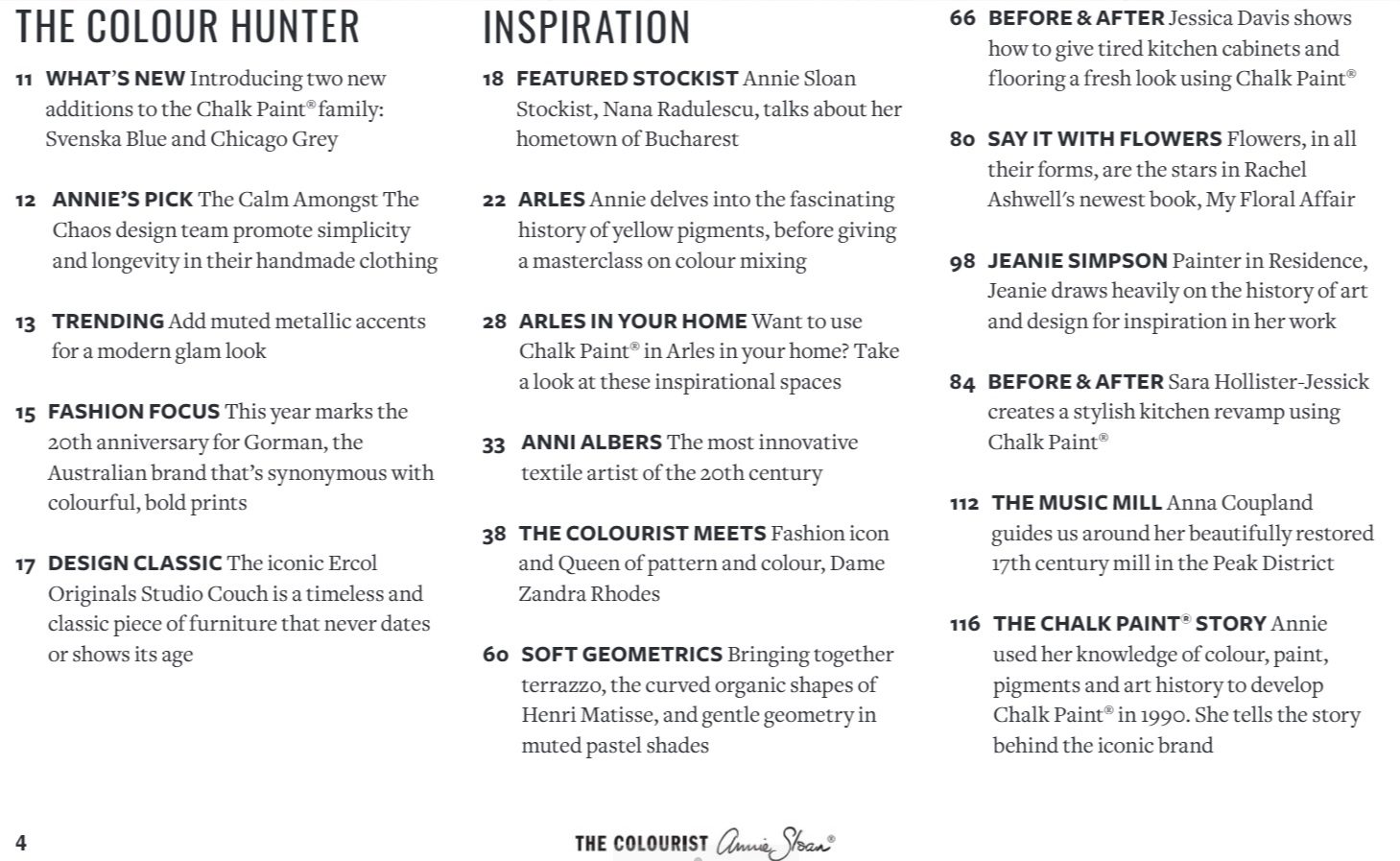 V druhom čísle "knihočasopisu" The Colourist nájdete opäť veľké množstvo inšpirácii zo sveta farieb Chalk Paint a návodov ako pracovať s farbami. Annie Sloan vás pozve do svojho sídla v Normandii a predstaví trojicu odtieňov farieb zo svojej palety - dve výrazne kontrastné odtiene Arles, Burgundy a neutrálny odtieň Chicago Grey.