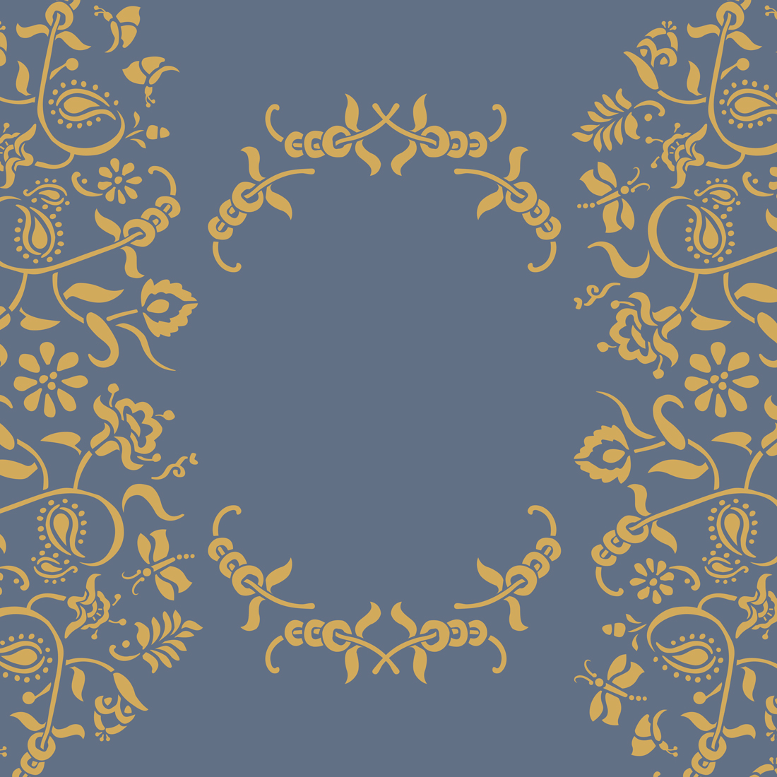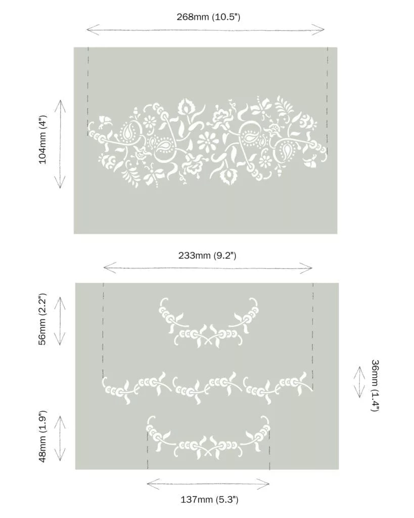 Šablónu Paisley Floral Garland je možné použiť ako kvetinovú bordúru pozdĺž rovných plôch alebo opakovane na vytvorenie jemného pôsobivého vzoru. Tvary sú inšpirované tradičnými indickými vzormi, kde základ tvorí tropické mango. Názov Paisley je inšpirovaný mestom v Škótsku, kde sa vyrábalo veľa šálov s kašmírovým vzorom.