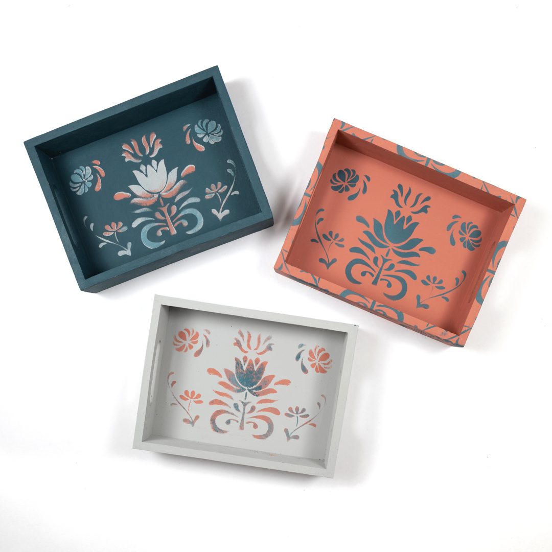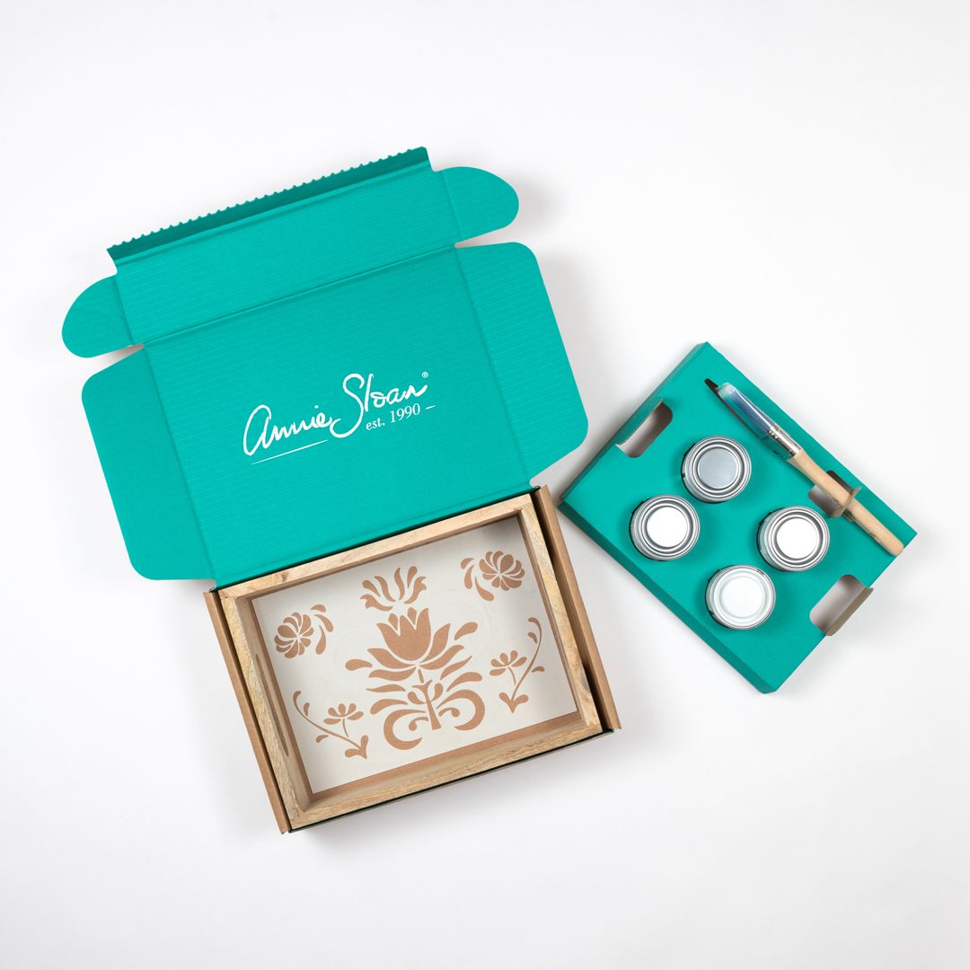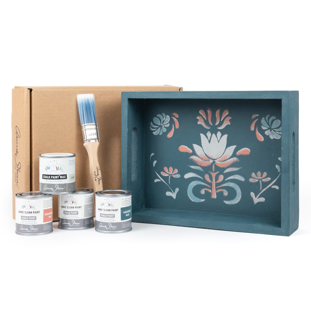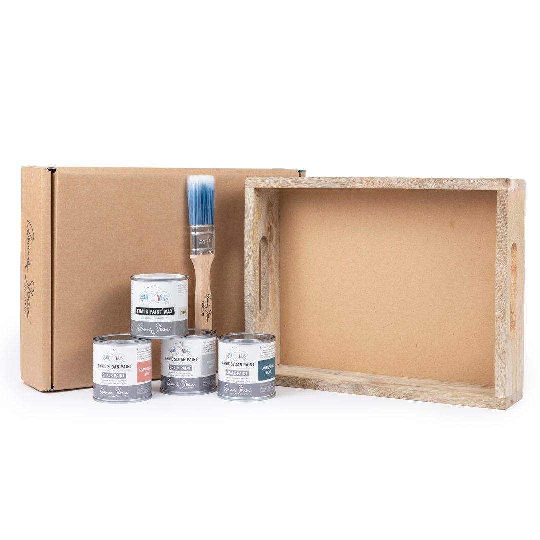 Sada obsahuje tri odtiene z palety Chalk Paint - Aubusson (modrý odtieň), Scandinavian Pink (ružový odtieň) a Chicago Grey (sivá), drevený podnos, malý plochý štetec a šablónku vytvorenú len pre tento účel.