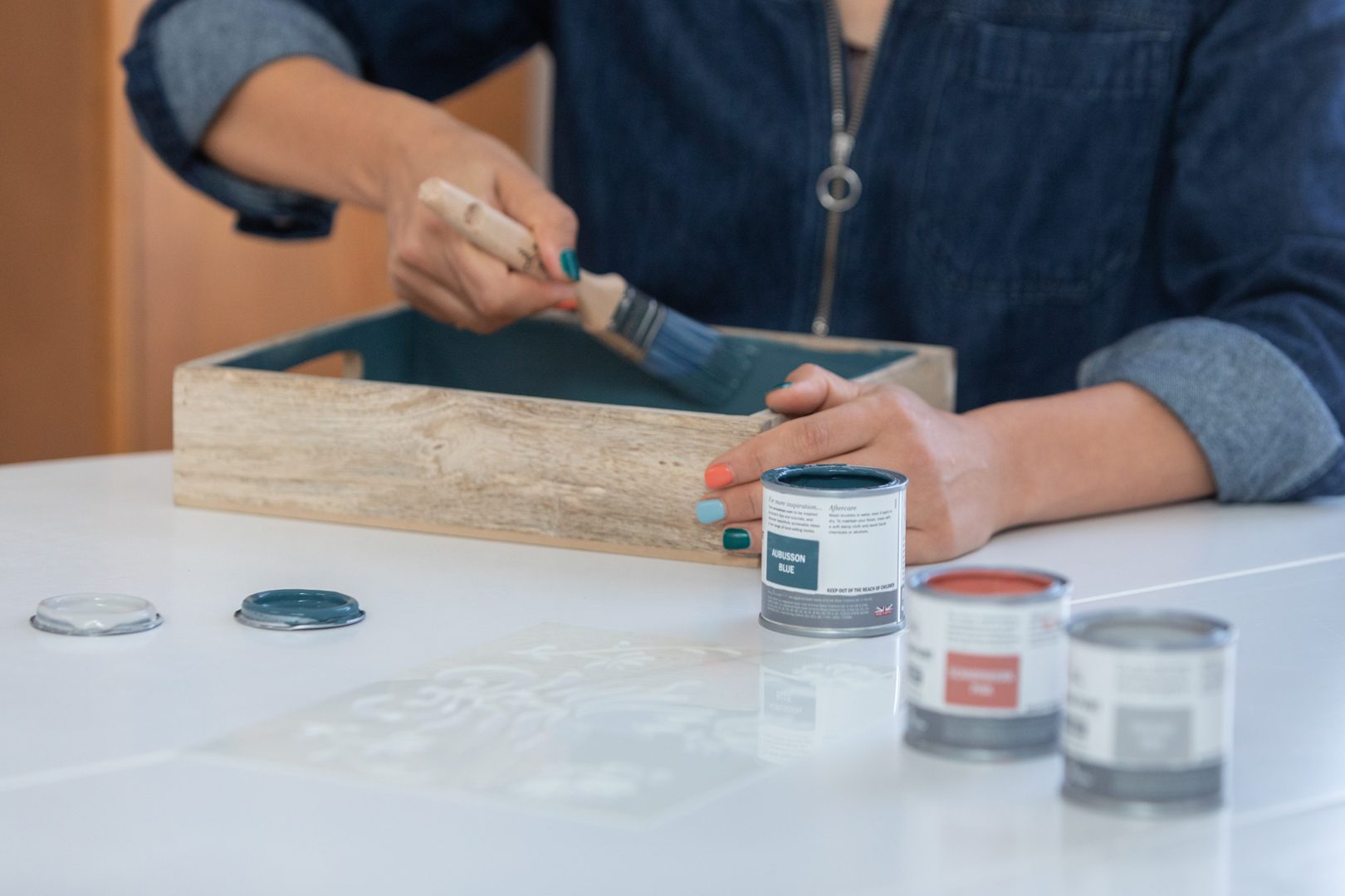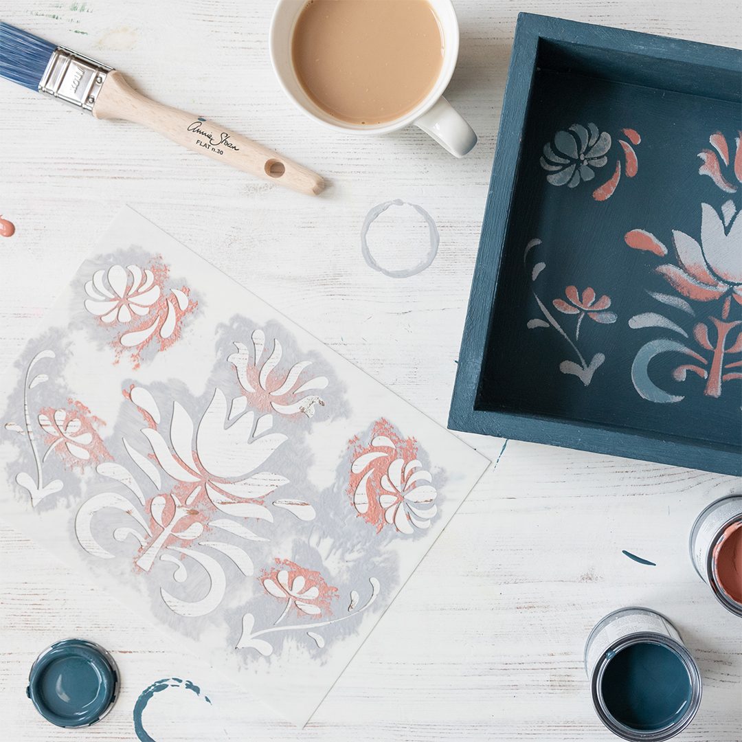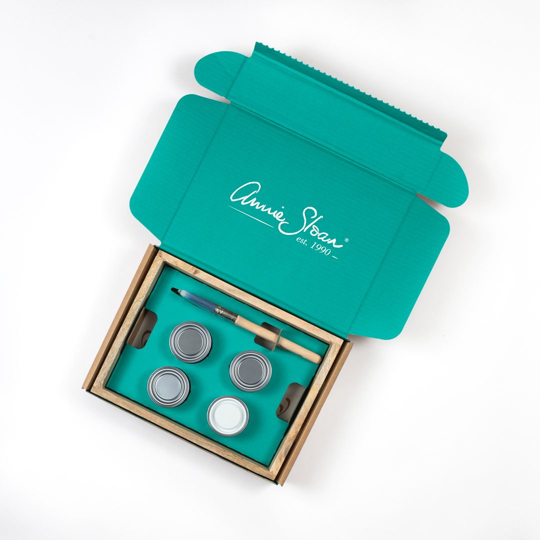 Sada obsahuje tri odtiene z palety Chalk Paint - Aubusson (modrý odtieň), Scandinavian Pink (ružový odtieň) a Chicago Grey (sivá), drevený podnos, malý plochý štetec a šablónku vytvorenú len pre tento účel.